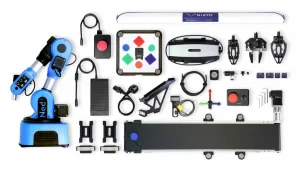 Der Niryo Ned2 ist ein kollaborativer Roboterarm mit 6 Achsen, der sowohl durch seine hohe Präzision als auch durch seine verbesserte mechanische Leistung überzeugt. Dank seines leichten und portablen Designs kann der Ned2 in unter 5 Minuten eingerichtet werden, was den Nutzern einen schnellen Einstieg und volle Funktionalität ermöglicht. Ein Förderband, 2 weitere Greifer, ein Vakuum-Greifer, ein E-Magnet-Modul und eine Kamera ergänzen den 6-achsigen Roboter und so können industrielle Produktionslinien nachbildet werden.